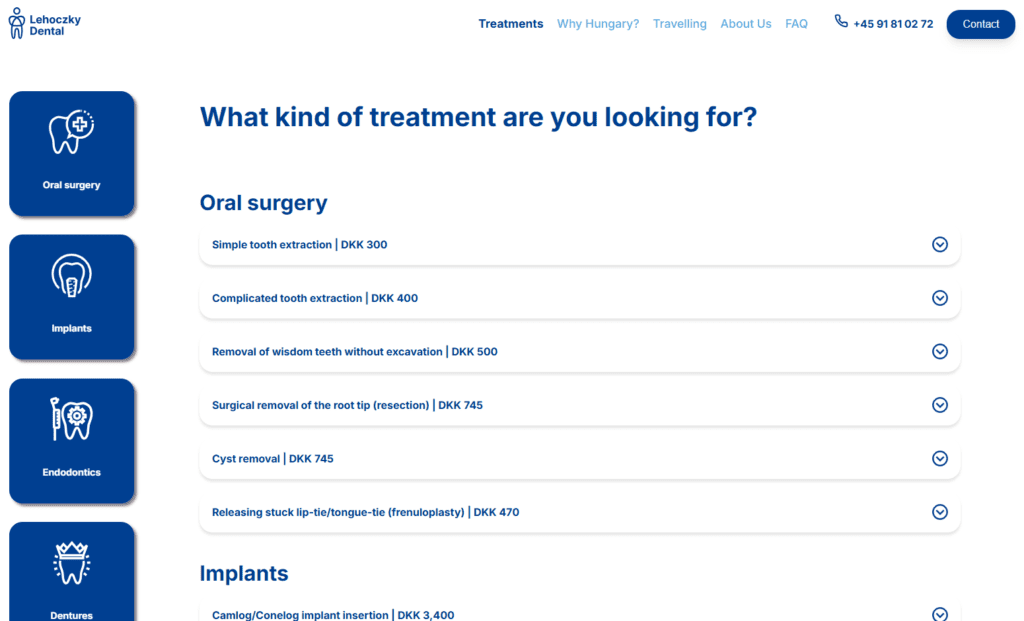 Another important feature was a price comparison tool that would clearly show the cost difference between dental care in Denmark and Hungary. We also considered adding a virtual tour of the clinic to give users a sense of the facility’s professionalism and modern equipment.