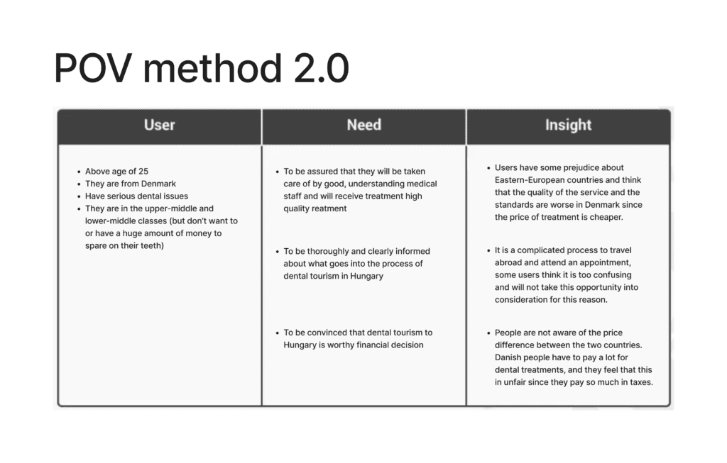 However, Danish users are hesitant to travel abroad for dental care due to concerns about cost, quality, and the logistics of planning a trip. Our challenge was to design a website that would address these concerns and make dental tourism in Hungary an attractive option for Danish users.
